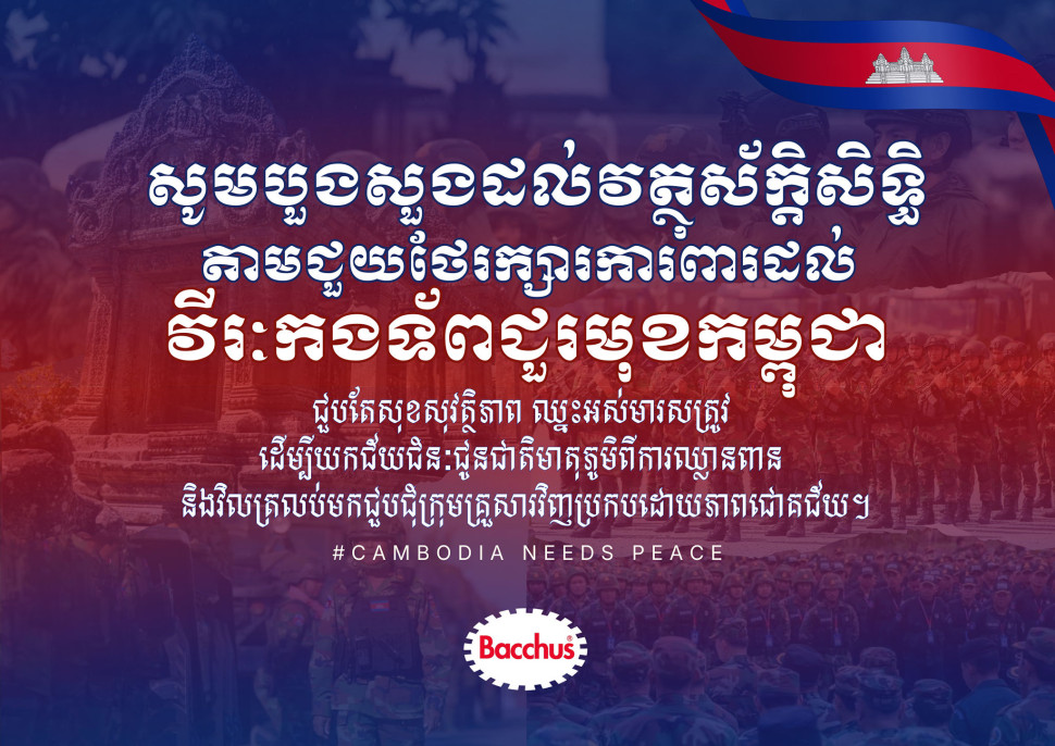 ក្រុមហ៊ុនភេសជ្ជៈប៉ូវកម្លាំងបាកាស (Bacchus) បានប្រកាសចូលរួមបរិច្ចាគថវិកាចំនួន ២០ម៉ឺនដុល្លារអាមេរិក ជូនចំពោះសម្តេចតេជោ ហ៊ុន សែន ដើម្បីចូលរួមចំណែកជួយឧបត្ថម្ភដល់កងទ័ពកម្ពុជាដែលកំពុងឈរជើងនៅជួរមុខ និងជនភៀសសឹក។ ការចូលរួមចំណែកឧបត្ថម្ភរបស់ក្រុមហ៊ុនភេសជ្ជៈប៉ូវកម្លាំងបាកាសនៅពេលនេះ គឺជាការបង្ហាញនូវទឹកចិត្តសប្បុរសធម៌ និងជាការលើកទឹកចិត្តដ៏ធំធេងចំពោះកងទ័ពដ៏អង់អាចក្លាហានរបស់កម្ពុជា ដែលកំពុងបំពេញបេសកកម្មការពារបូរណភាពទឹកដីយ៉ាងរឹងមាំ និងជាប់ជាប្រចាំ នៅតាមបណ្តោយព្រំដែនកម្ពុជា-ថៃ។ គួររំលឹកផងដែរថា សម្តេចតេជោ ហ៊ុន សែន បានធ្វើការអំពាវនាវដល់បងប្អូនប្រជាពលរដ្ឋខ្មែរគ្រប់មជ្ឈដ្ឋាន…