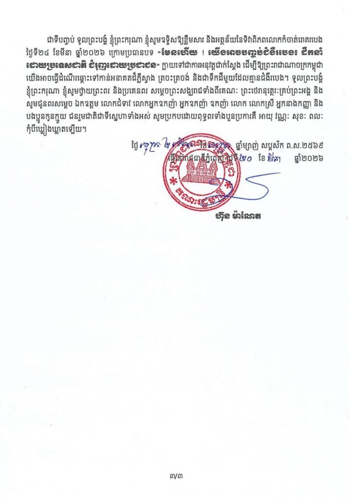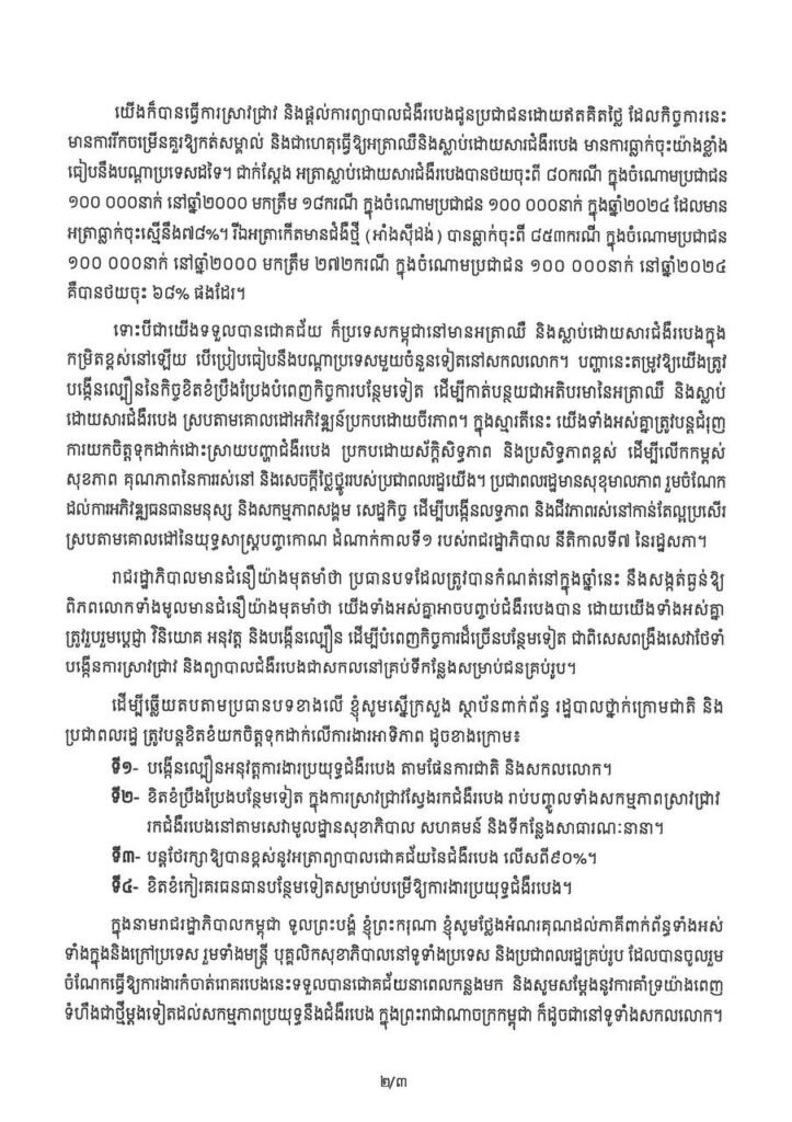 សម្តេចបវរធិបតី ហ៊ុន ម៉ាណែត ចេញសារលិខិតក្នុងឱកាស ប្រារព្ធទិវាពិភពលោកកំចាត់រោគរបេង ក្រោមប្រធានបទ៖ «មែនហើយ ! យើងអាចបញ្ចប់ជំងឺរបេង៖ ដឹកនាំដោយប្រទេសជាតិ ជំរុញដោយប្រជាជន»